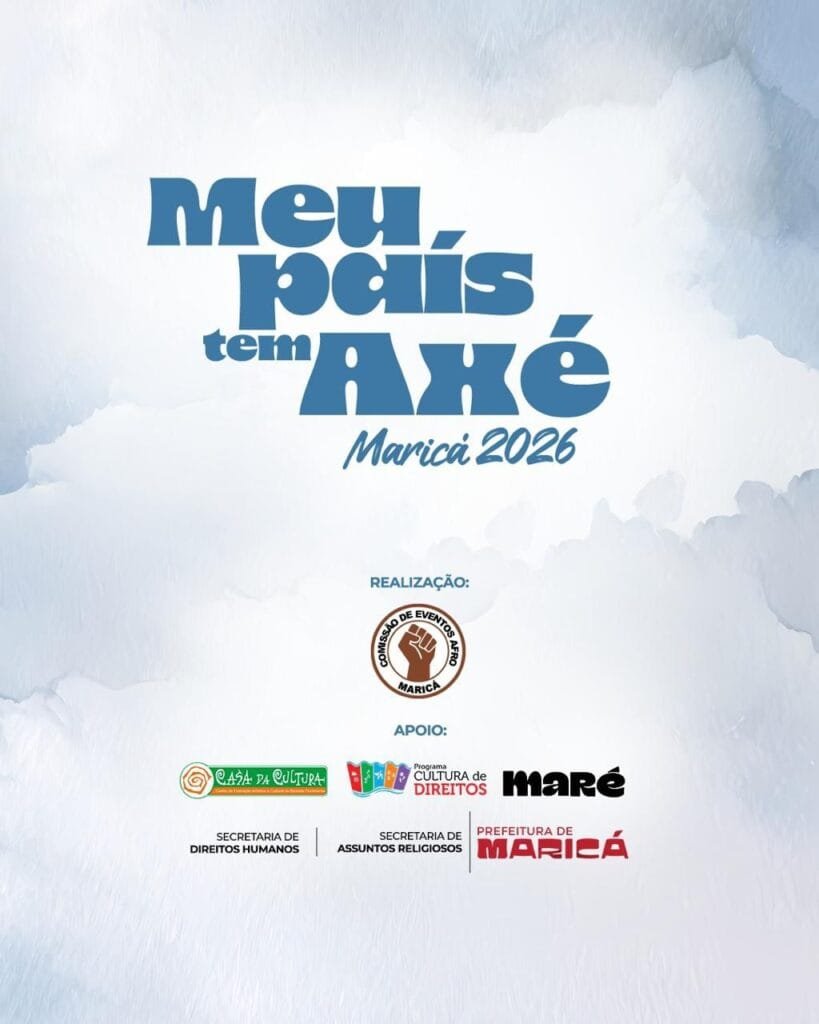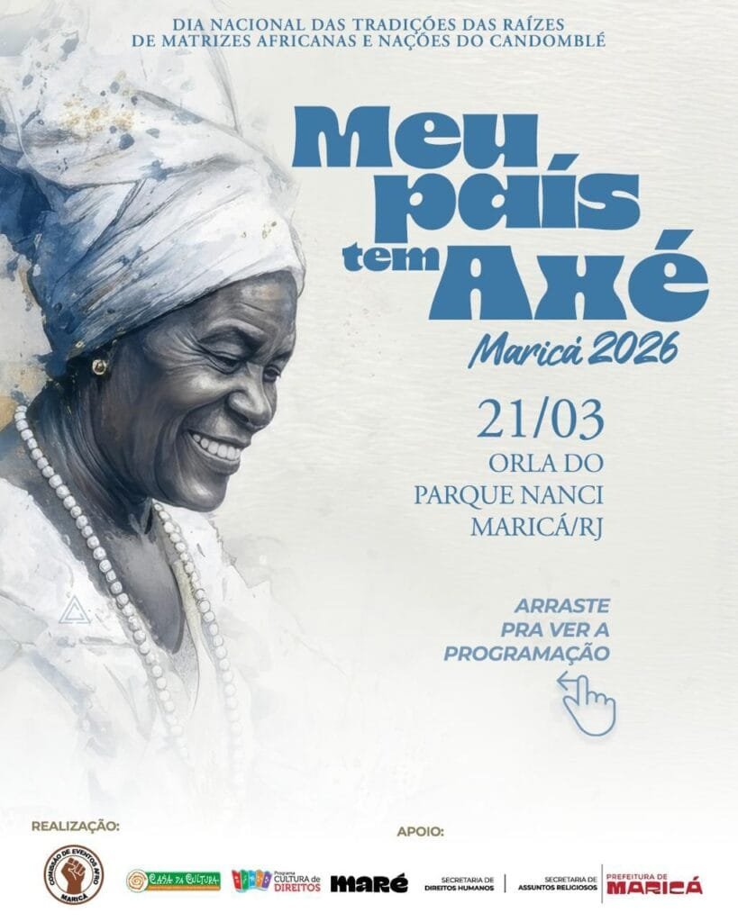 A cidade de Maricá recebe, no próximo dia 21 de março de 2026, o evento “Meu País Tem Axé – Maricá 2026”, na Orla do Parque Nanci. A programação reúne manifestações culturais, atividades religiosas, rodas de diálogo e apresentações musicais.